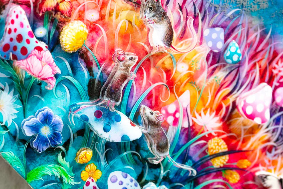Medium: Unique circular limited edition on board with gloss resin finish. Featuring raised 3D elements. This edition has a box edge and does not require framing, it is strung ready to be presented unframed.