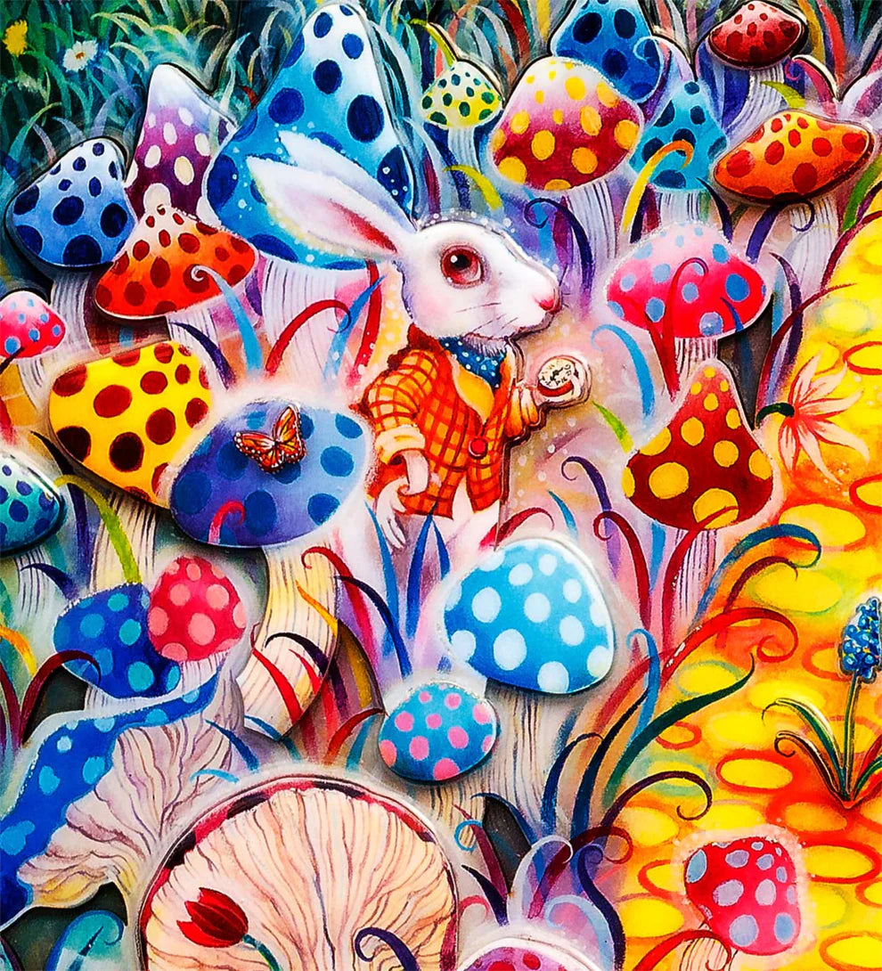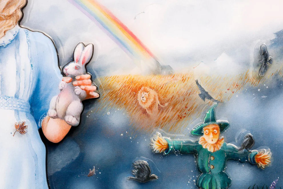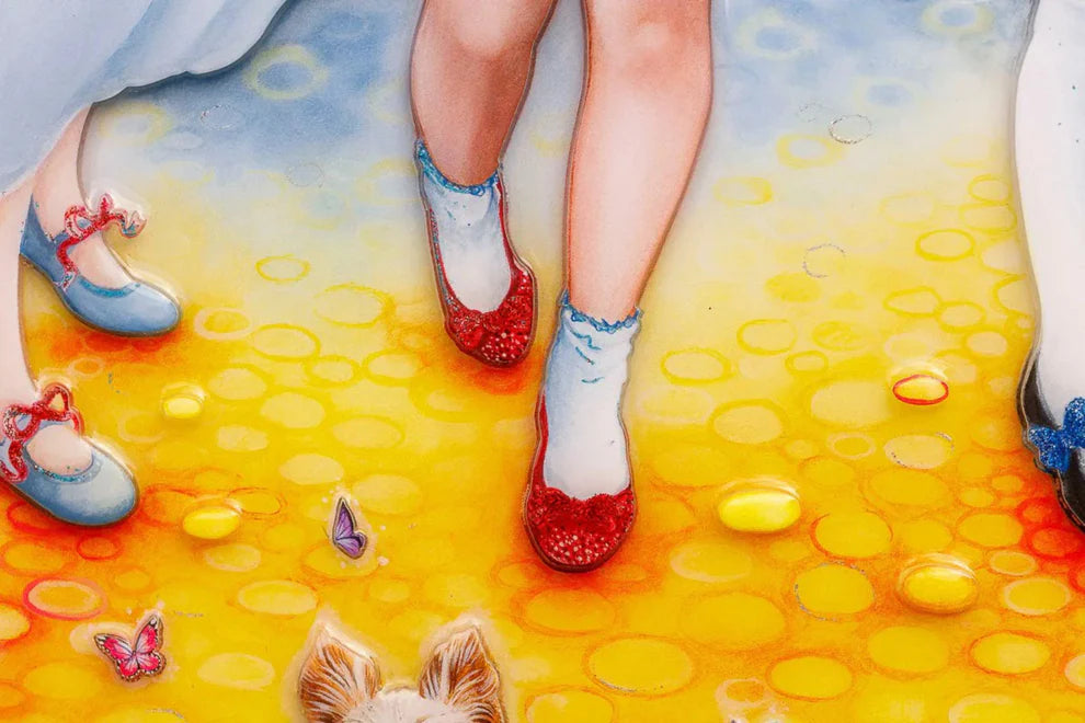 "The inspiration for this painting came from a little daydream I had - I saw the three girls meeting as young teenagers in a dreamscape; Wendy, Dorothy and Alice relaying their experiences to each other. I set about weaving their stories into the same piece in the background, moving out from their own realities onto a path leading into their respective magical worlds.